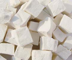 FD豆腐是以大豆為原料加工而成,水分在5%以下,尺寸在15×12×8mm、12×12×12mm、12×12×6mm不等,色澤淺黃色或白色。真空冷凍干燥豆腐結構緊密,但不失鮮嫩豆腐固有的口感特征,可干食或加工成佐餐湯料后食用,該產品用95℃以上的清水浸泡30秒鐘即可復原,復原后的產品口感細膩、潤滑、鮮豆乳味道突出。